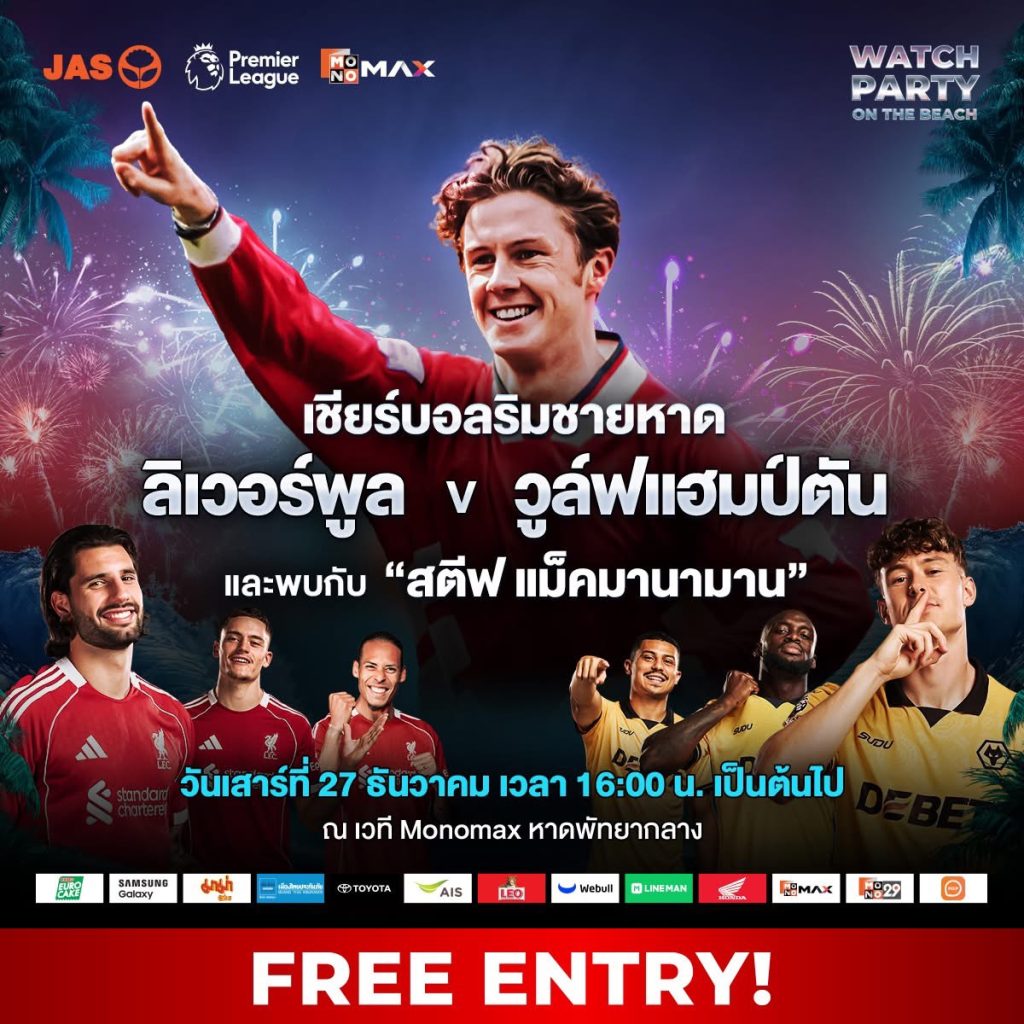 เข้างานฟรี ! ครั้งแรก กับ ปาร์ตี้เชียร์บอลบนจอยักษ์ ริมชายหาด พร้อมลุ้น Meet & Greet กับนักเตะระดับตำนาน “สตีฟ แม็คมานามาน” รายละเอียดกิจกรรม 📅 วันเสาร์ที่ 27 ธันวาคม 2568🕒 เริ่มกิจกรรมเวลา 16:00